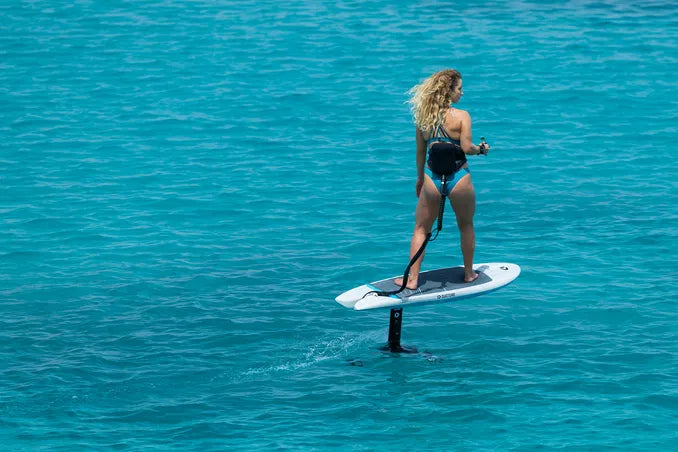 The Foil Assist Remote - a waterproof smartwatch-style controller with a finger ring - keeps your hands free, making it easier to paddle, or push up on the board. Activate the motor with a double-click on the + button, and control the speed by pressing and holding either the + or - button.